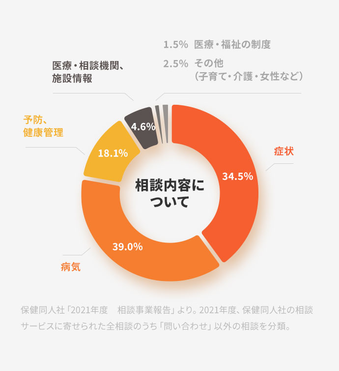 病気や気になる症状についての不安、受診の目安、子どもの健康や介護など、不安や悩みを抱えた多くの方から相談が寄せられています。